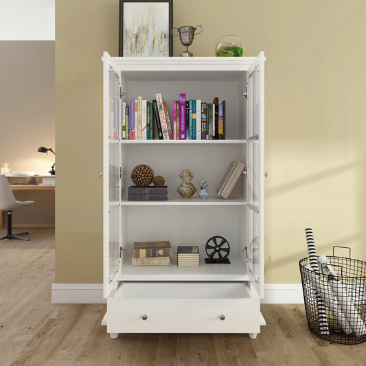 55" H White Bookcase with Glass Doors, Display Cabinet Wooden Bookshelf Organizer with Drawer for Home Office Living Room