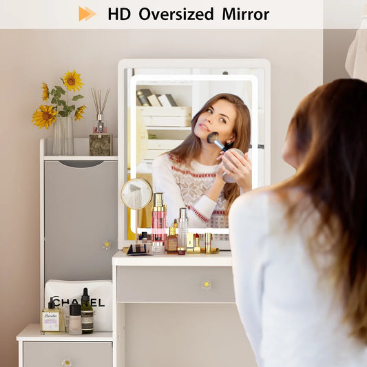 Makeup Vanity Dressing Table with Sliding Lighted Mirror, 4 Drawers and Shelves, Dresser Desk with Cushioned Stool for Women Girl, White&Gray