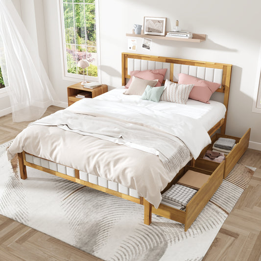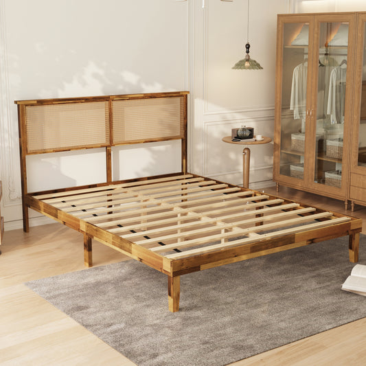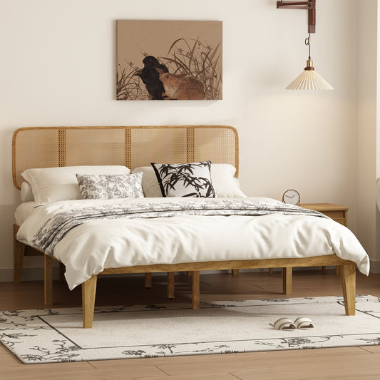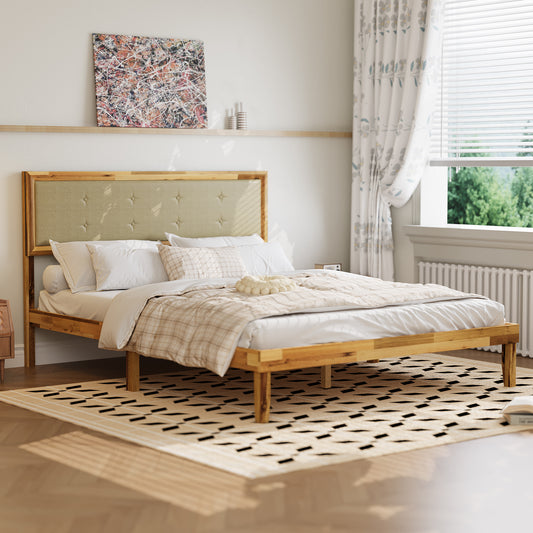 Oxylife Queen Size Solid Wood Platform Bed Frame with Vintage Headboard,15 Slats,Natural Color,82.6”L x 63.9”W x 41.1”H
