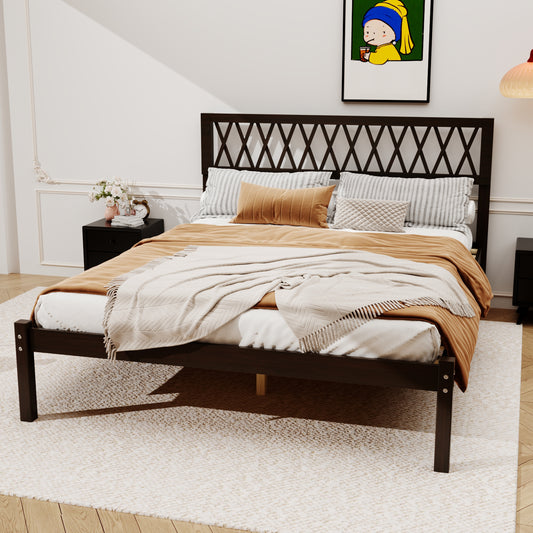 Oxylife Queen Size Solid Wood Platform Bed Frame with Vintage Headboard,12 Slats,Deep Walnut, 83.8”L x 63.2”W x 41.1”H