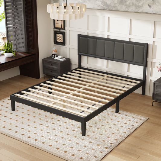 Oxylife Queen Size Solid Wood Platform Bed Frame with Vintage Headboard,15 Slats,Black,82”L x 63.3”W x 40.9”H