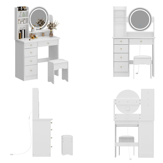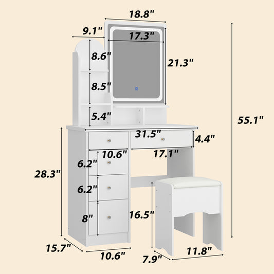 Oxylife Vanity Table Set with Mirror and Dimmable LED Lights, Makeup Table with 5 Drawers and Shelves, Dressing Vanity Tables for Girls Women, White