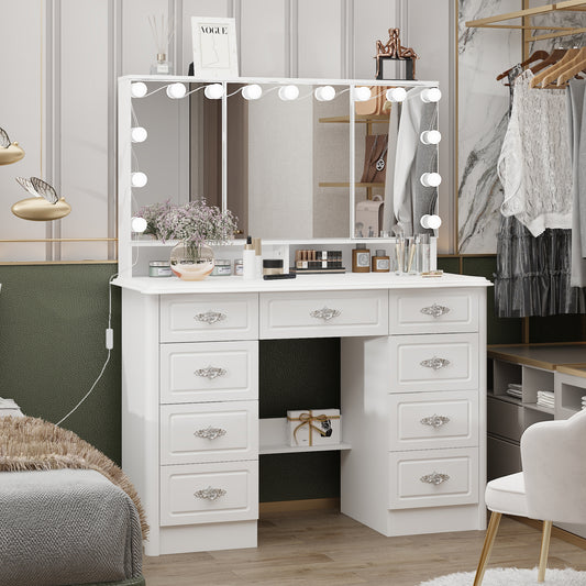Oxylife Vanity Desk with Lighted Mirror, Makeup Dressing Table with 9 Drawer and Drawer Divier for Bedroom