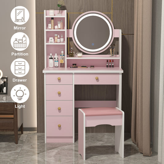 Oxylife Vanity Set with Lighted Mirror, Girls Makeup Vanity Table with 5 Drawers, Shelves and Stool, Pink