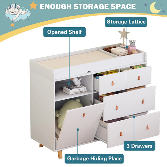 OXYLIFE 33.5" Baby Changing Table Nursery Dresser with 4 Drawers, Shelf and Trash Can Storage for Nursery Room, White
