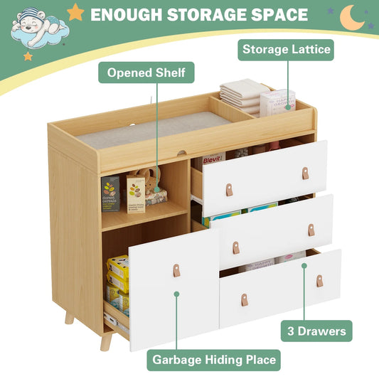 OXYLIFE Baby Nursery Changing Table Dresser with 3 Drawers and Shelf for Nursery Room, White+Natural