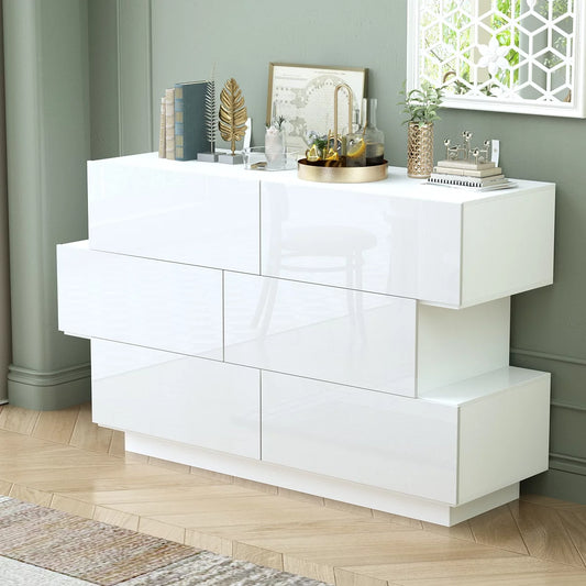 Modern 6 Drawer Dresser Storage, Stylish Shape Wood Chest of Drawer Chest for Bedroom Living Room, White Glossy Finish