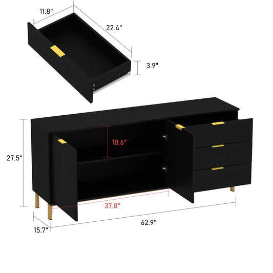 OXYLIFE Modern Sideboard Buffet Storage Cabinet with 3 Drawers for Living Room Black