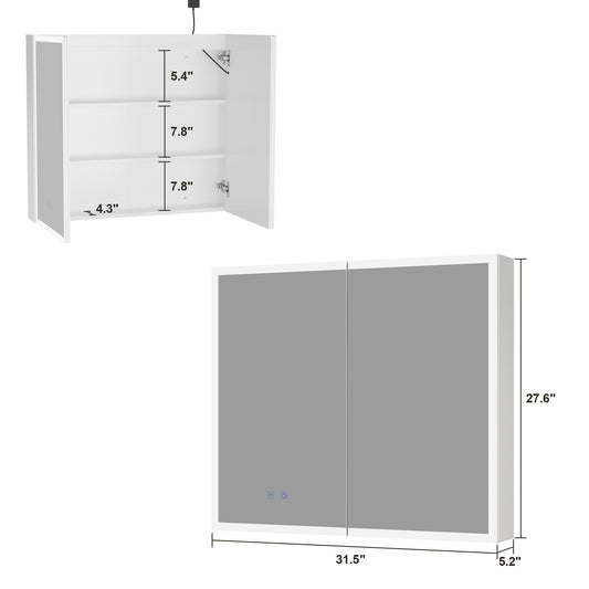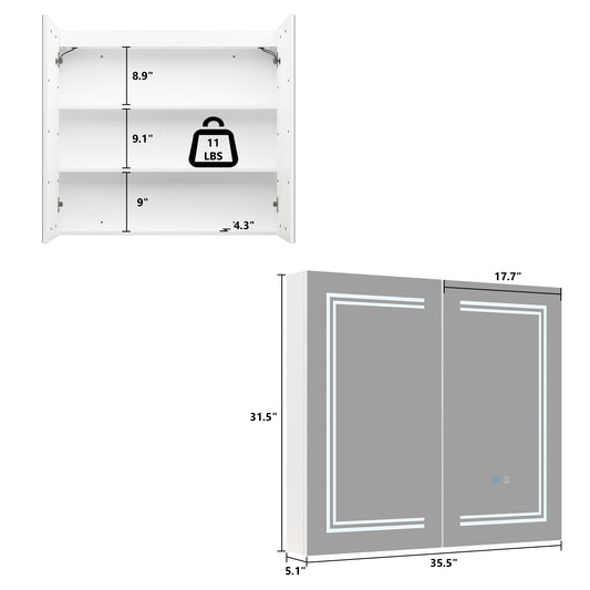 OXYLIFE 35.5" Wall Mounted Mirror Medicine Cabinet with 3 Color Adjustable LED Lights, Defogger and 2 Doors for Bathroom, White