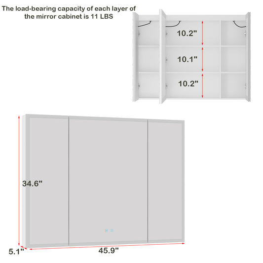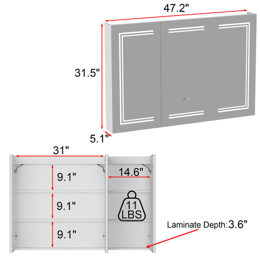 OXYLIFE 47.2" Wall Mounted Mirror Medicine Cabinet with 3 Color LED Lights, Defogger and 3 Doors for Bathroom, White