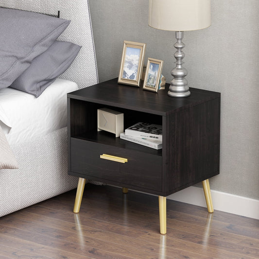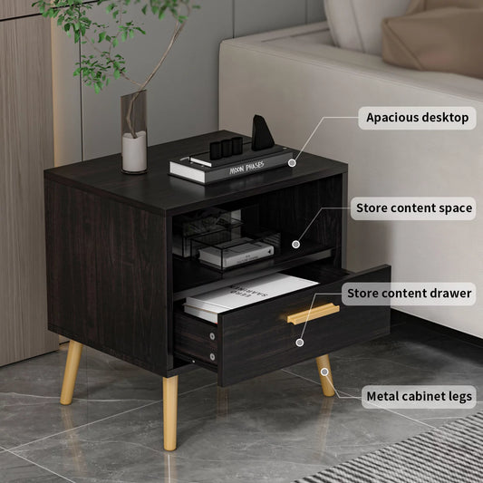 OXYLIFE Modern Nightstand Bedside Table, End Side Table with Drawer and Open Cubby, Black&Brown