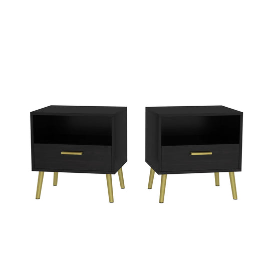 OXYLIFE Nightstand Set of 2 Bedside, End Side Table with 2 Drawers & Gold Metal Legs for Bedroom, Black