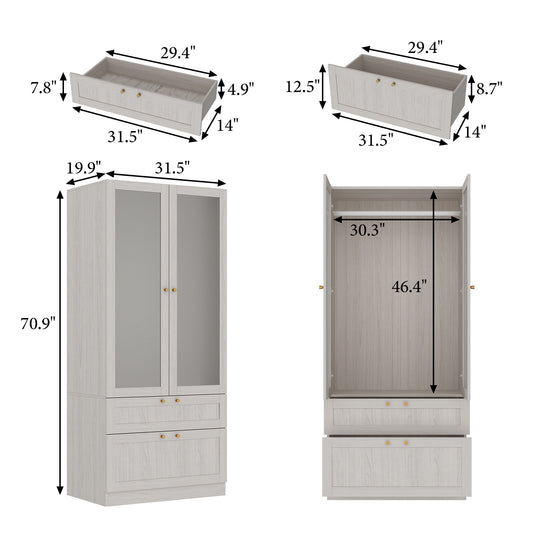 OXYLIFE 70.9 inch Freestanding Clothing Armoire Wardrobe Closet with 2 Frosted Glass Doors, Hanging Rod and Drawers for Bedroom