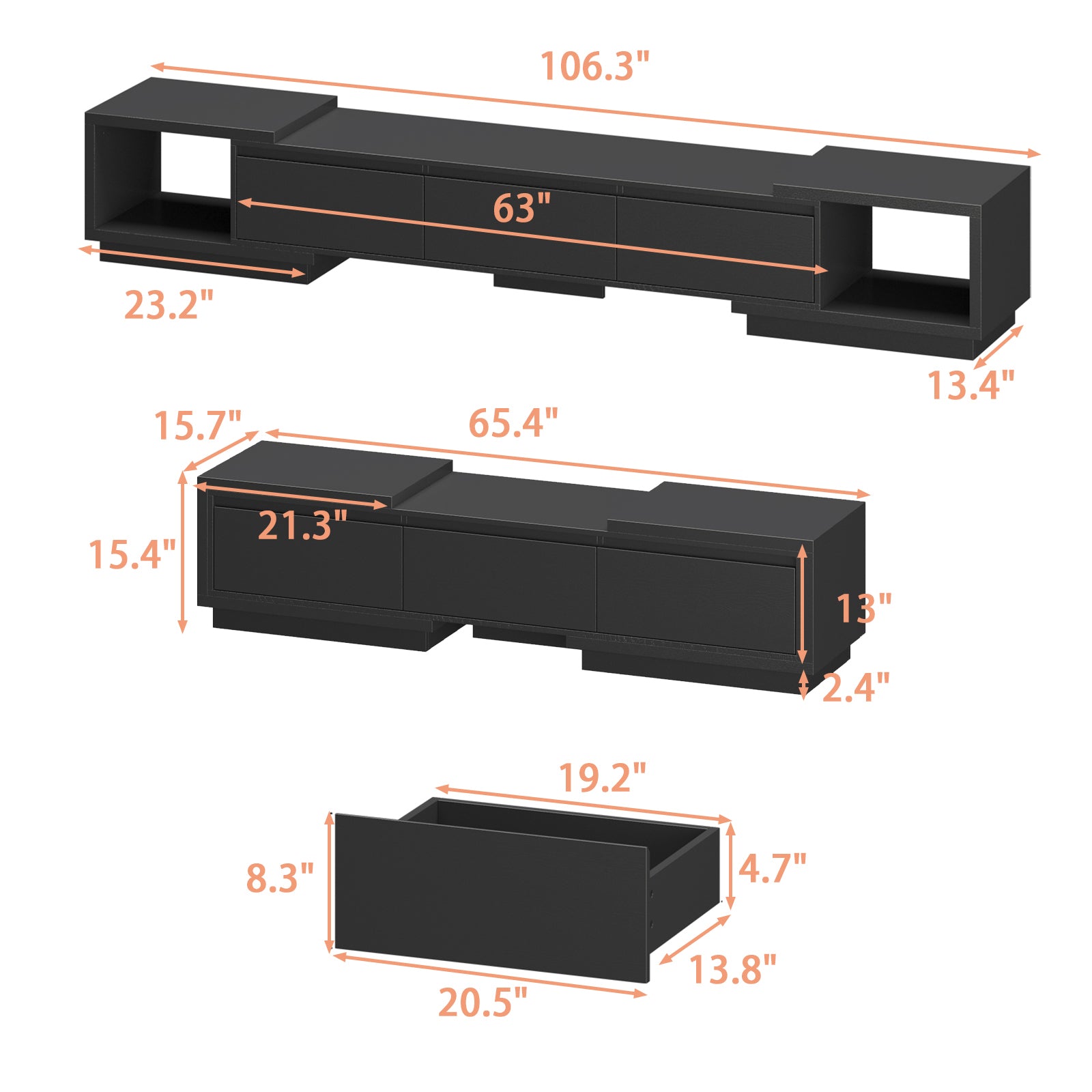 - Overall Dimension: 65.4~106.3" W x 15.7" D x 15.4" H, Color: Black