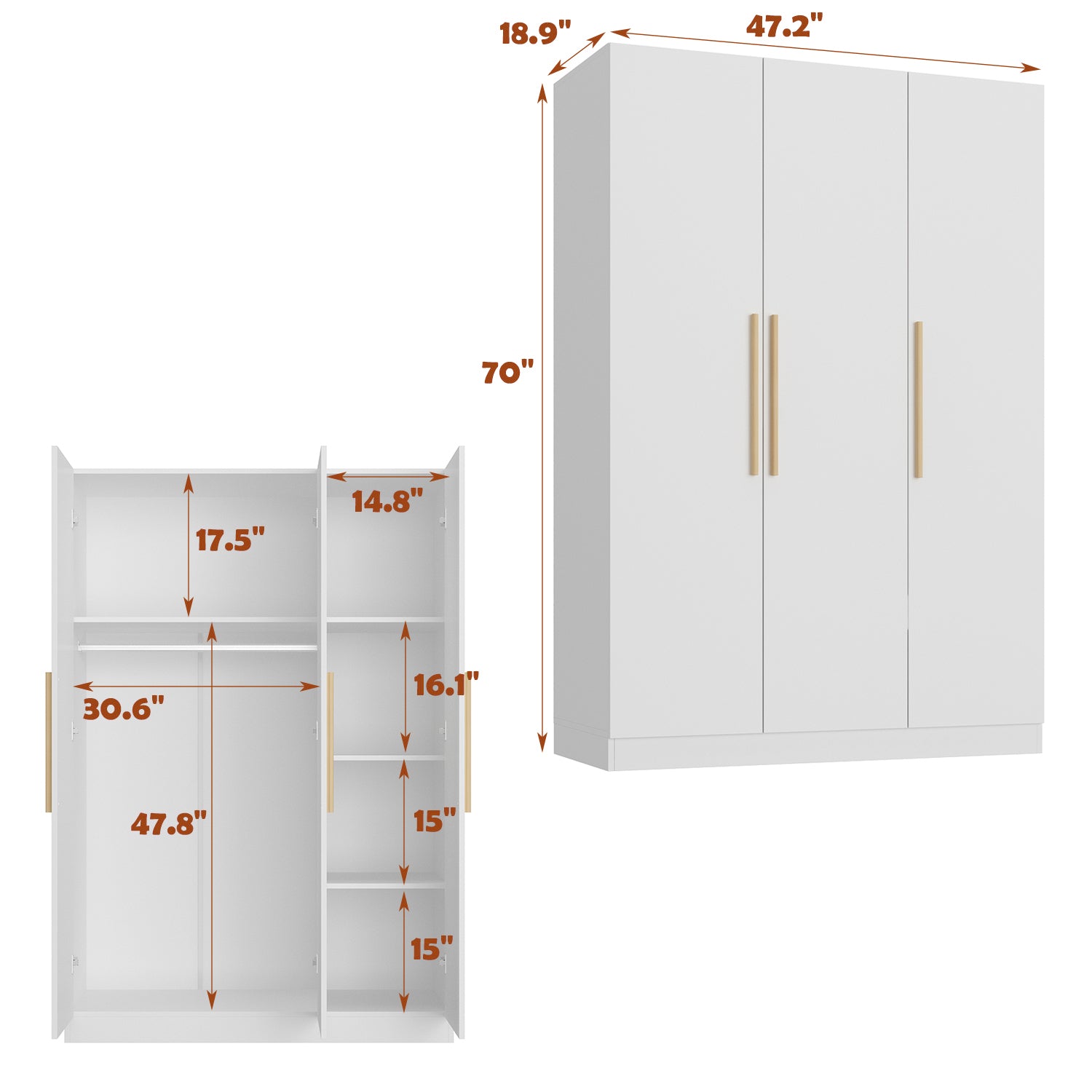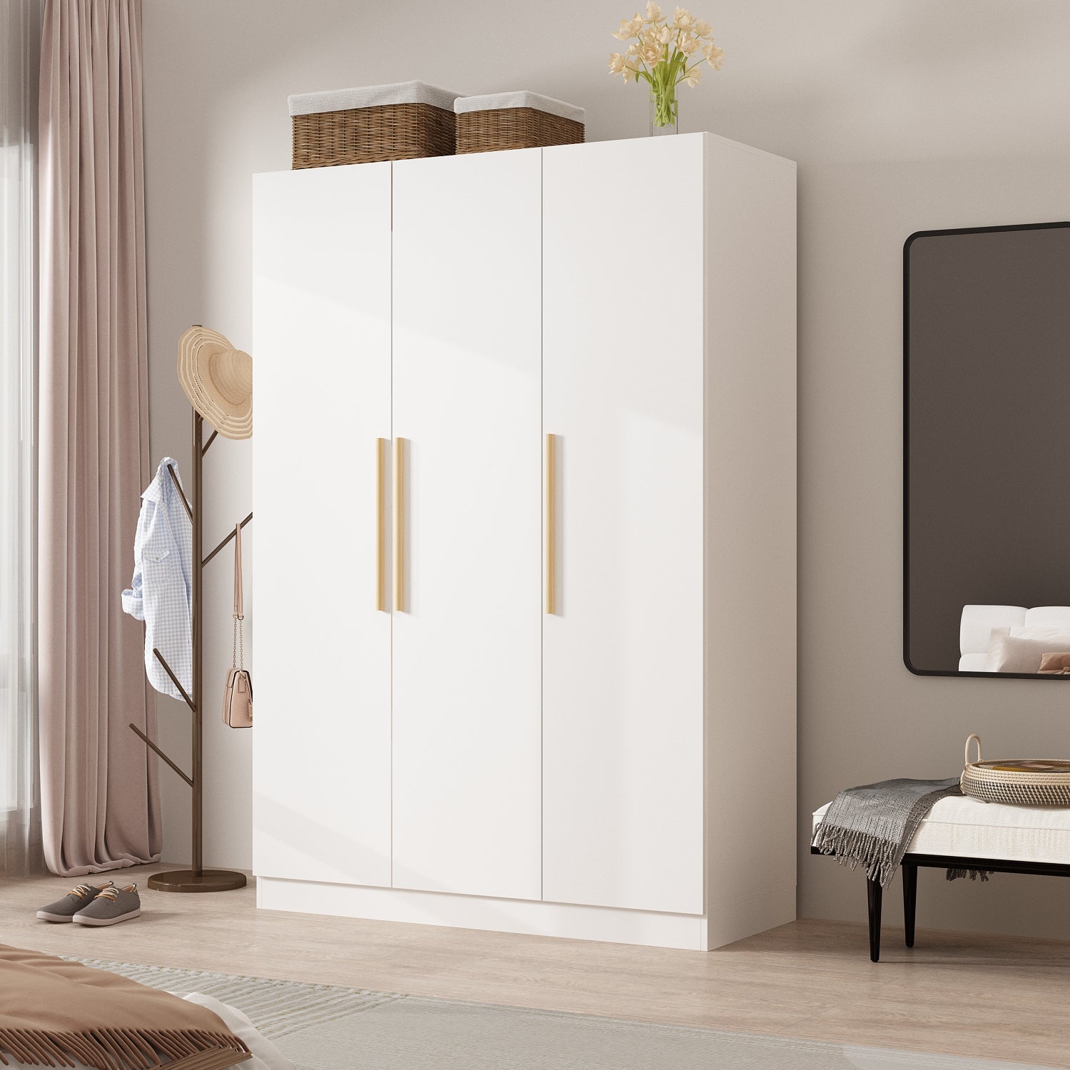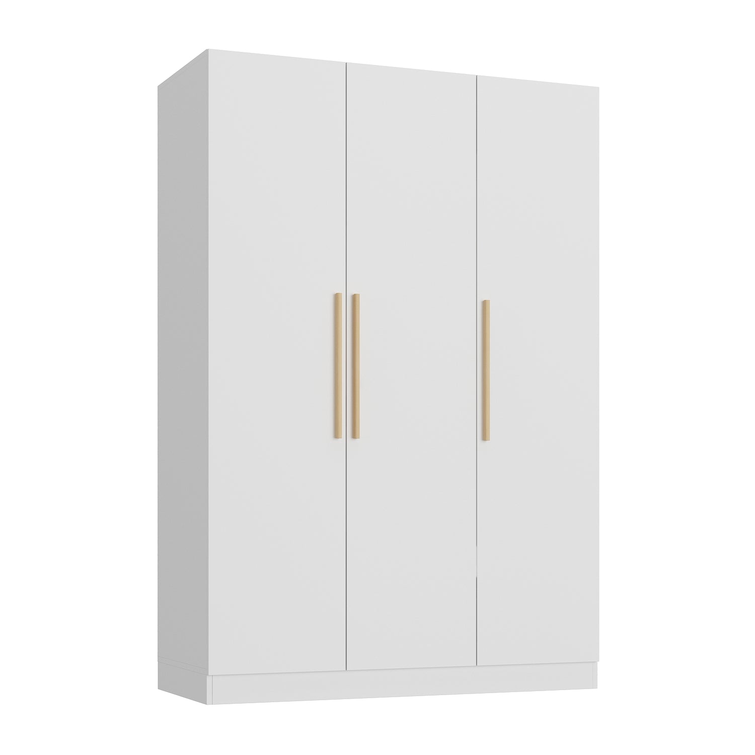 - Stylish 3-door wardrobe armoire with a minimalist design, combining white board with golden handles to create an elegant charm.