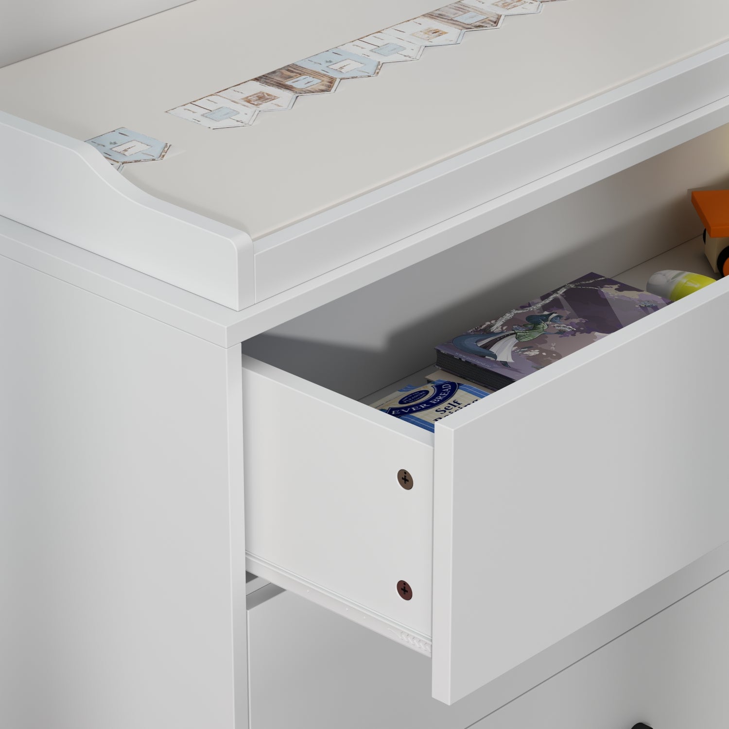 - Includes a removable changing topper that provides a secure and comfortable changing space for baby, while safety stops on the drawers keep little hands protected.